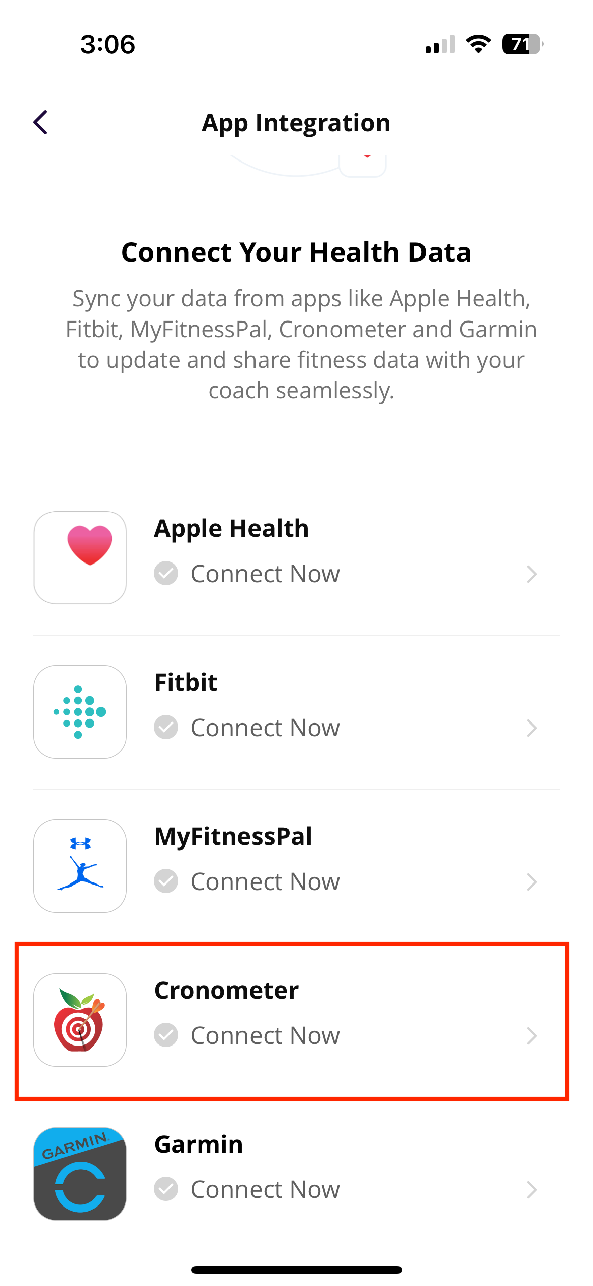 Note: Make sure your coach has turned on the 'Macros' feature for you to be able to see the Cronometer integration.